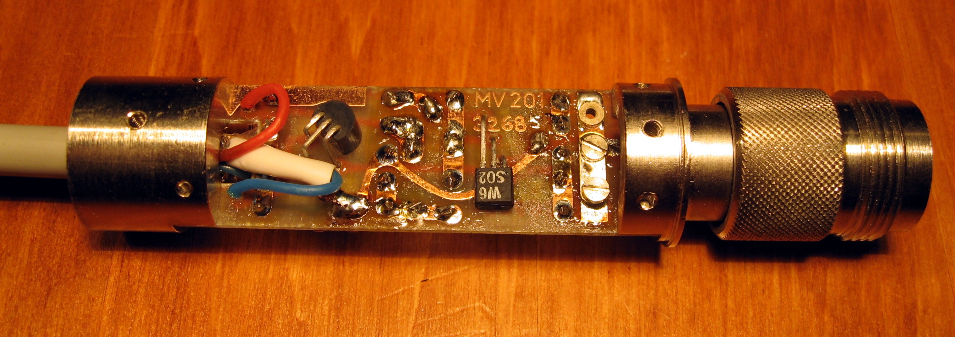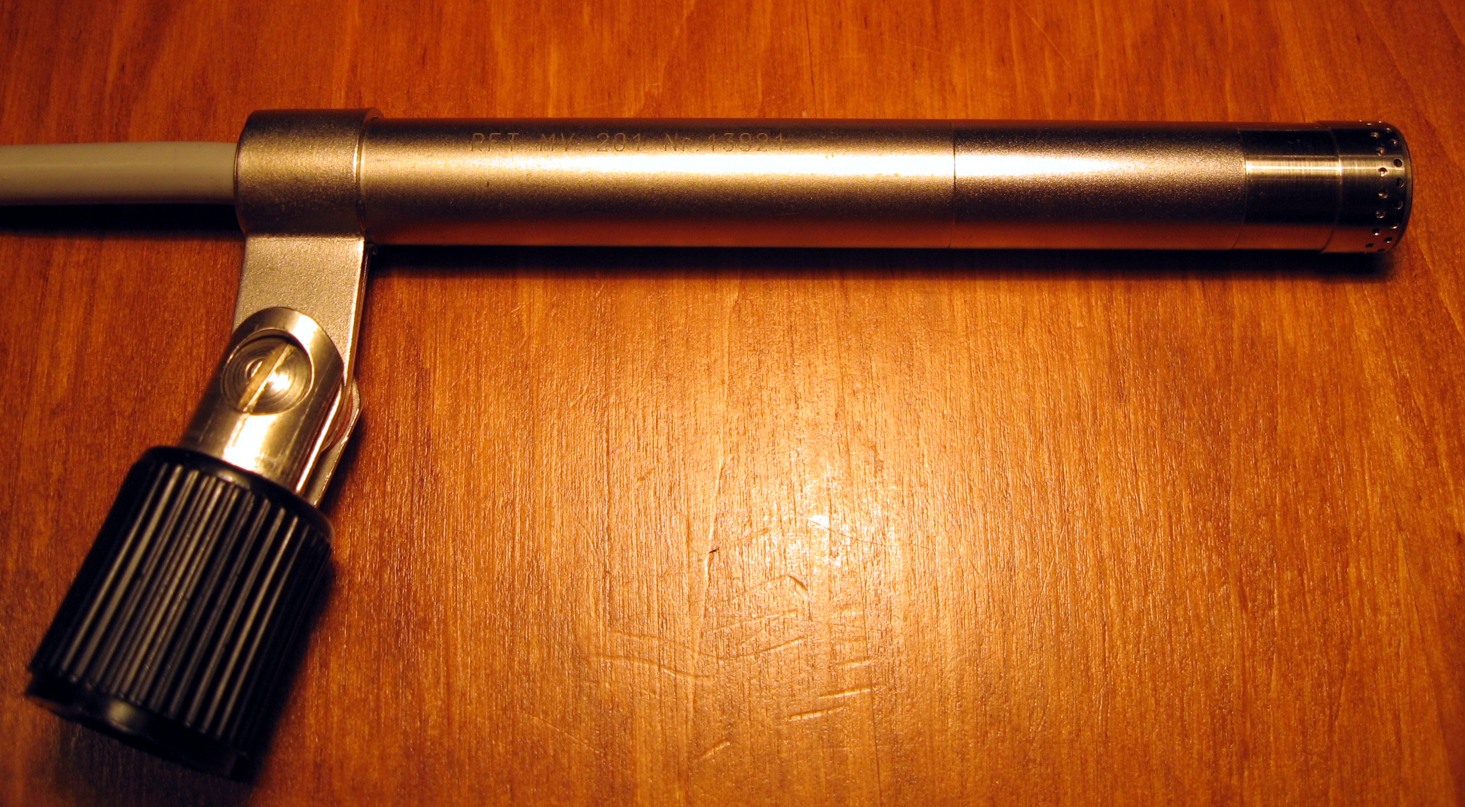 Kondenzátorový tranzistorový mikrofon MV 201 výroce R-F-T - DDR se vyráběl pravděpodobně v sedmdesátých až osmdesátých letech minulého století. Byl určen pro přesná elektroakustická měření. Mikrofon je pevně propojen kabelem s předzesilovačem, který tvoří připojovací konektor. Na těle mikrofonu je pevně osazen držák se závitem 1/4´ pro mikrofonní stativ. Velmi malý průměr těla mikrofonu přispívá k dokonalé kulové snímací charakteristice. Tělo mikrofonu i předzesilovače je celokovové. Mikrofon má zabudované vyhřívání - temperování.