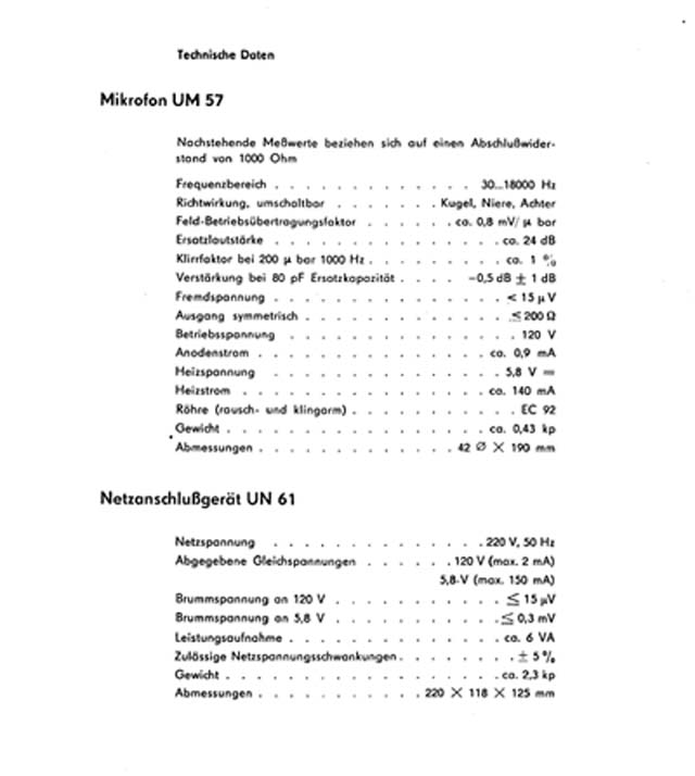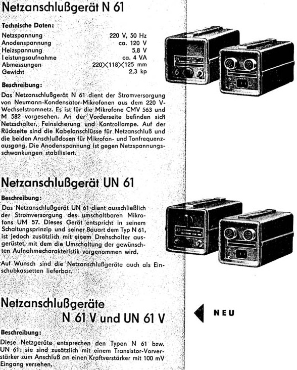 Napaječ byl určený pro napájení předzesilovačů kondenzátorových mikrofonů Neumann s elektronkou EC 92 ( UM57) se změnou charakteristiky pomocí přepínání polarizačního napětí kapsle přepínačem na napaječi. Napaječem je možné napájet i mikrofony bez změny charakteristiky ( CMV563, M582).