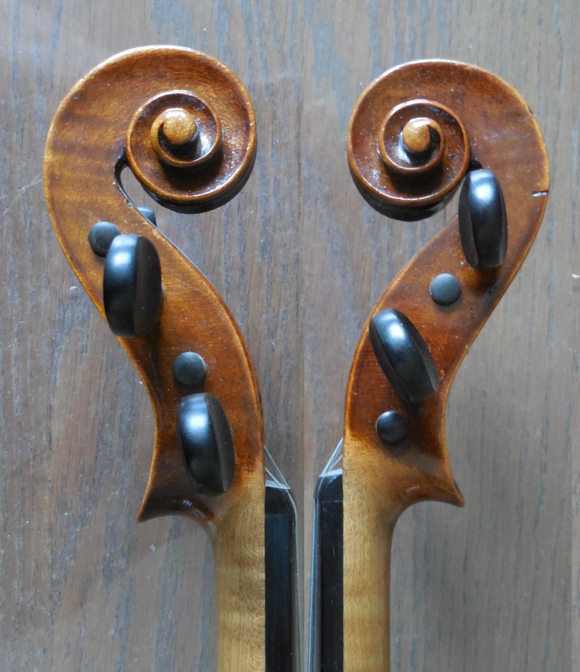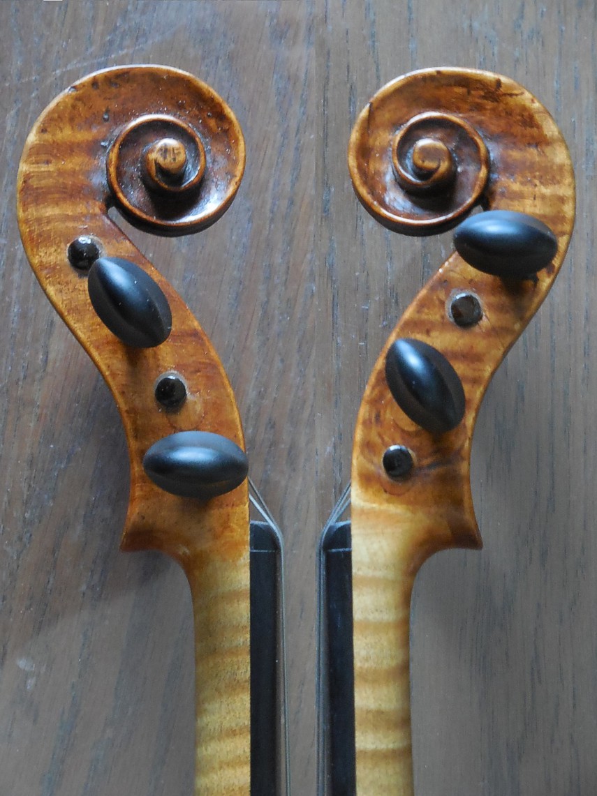 Nepamatuji se již, kdo mi tyto housličky donesl. Byly naprosto v rozkladu, zřejmě působením vlhka. Naštěstí toho moc nechybělo. Dohromady mi je dal houslař pan Petlach ze Sivic. Je to tzv. školní nástroj s typickým prokopovským klenutím desek, manufakturně vyrobený opět v Lubech u Chebu (Schönbach). Zajímavý je javor na zadní desce s pěkným žíháním pod tmavým lakem.