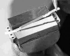 Po uříznutí pásku začíná ta správná legrace. Pásek se dá od podkladového papíru oddělit navlčením lihem. Na sklo nalejeme trochu lihu a v něm se pásek oddělí. Lehoučký jemňoučký pásek se všelijak kroutí, jeho pevnost je minimální, reaguje na sebemenší statickou elektřinu. Aby se s ním dalo alespoň trochu zacházet je potřeba ho udržovat navhčený v lihu. Odděleným podkladovým papírem, který je vlastně stejně široký jako pásek, vyzkoušíme přesnost uříznuté šířky zkusmým vložením do štěrbiny mikrofonu.