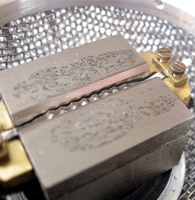 Nejříve je potřeba uříznout příslušný proužek plátkového hliníku, což se nejlépe provede na skleněné destičce podle ocelového pravítka ostrou žiletkou. Lámací skalpel se mi moc neosvědčil. Hliník se řeže včetně podkladového papíru. Délka pásku bude vlivem budoucího zvlnění cca 2x delší než je délka štěrbiny. Šířku štěrbiny pro pásek změříme šuplerou. Šířka pásku pak bude jen o chlup menší. Pásek musí být umístěn ve štěrbině s minimální mezerou, nesmí však o pólové nástavce nikde drhnout. Štěrbina pro pásek musí být bezvadně čistá. Případné nečistoty z pólových nástavců odstraníme přikládáním samolepky, kdy nečistoty ulpí na lepivé ploše.